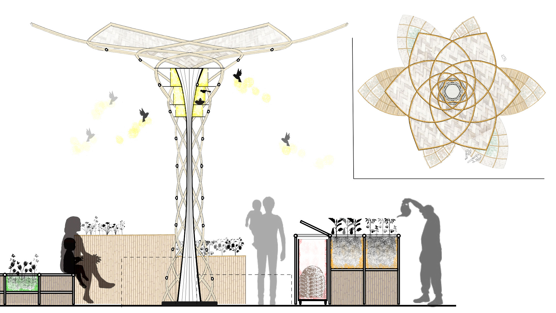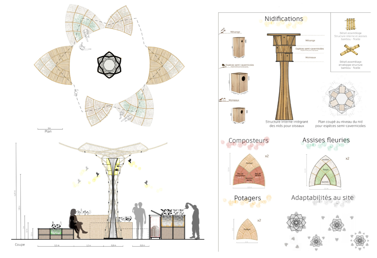 Création un mobilier urbain qui permet de favoriser la biodiversité en ville, et avec pour vocation d’accueillir différentes espèces d’oiseaux et un point de compost à destination des habitants. Nous avons pris en compte la place de la nature en ville ainsi que son interaction avec les résidents.