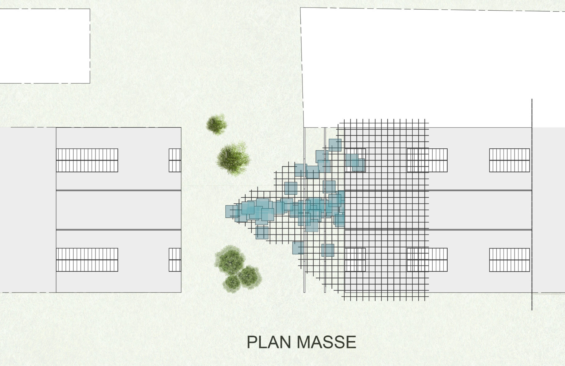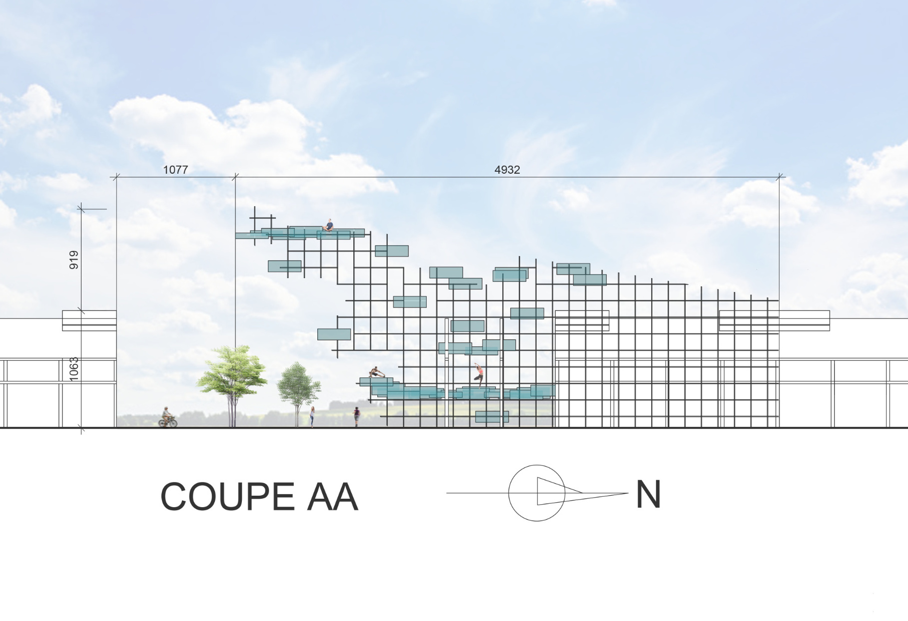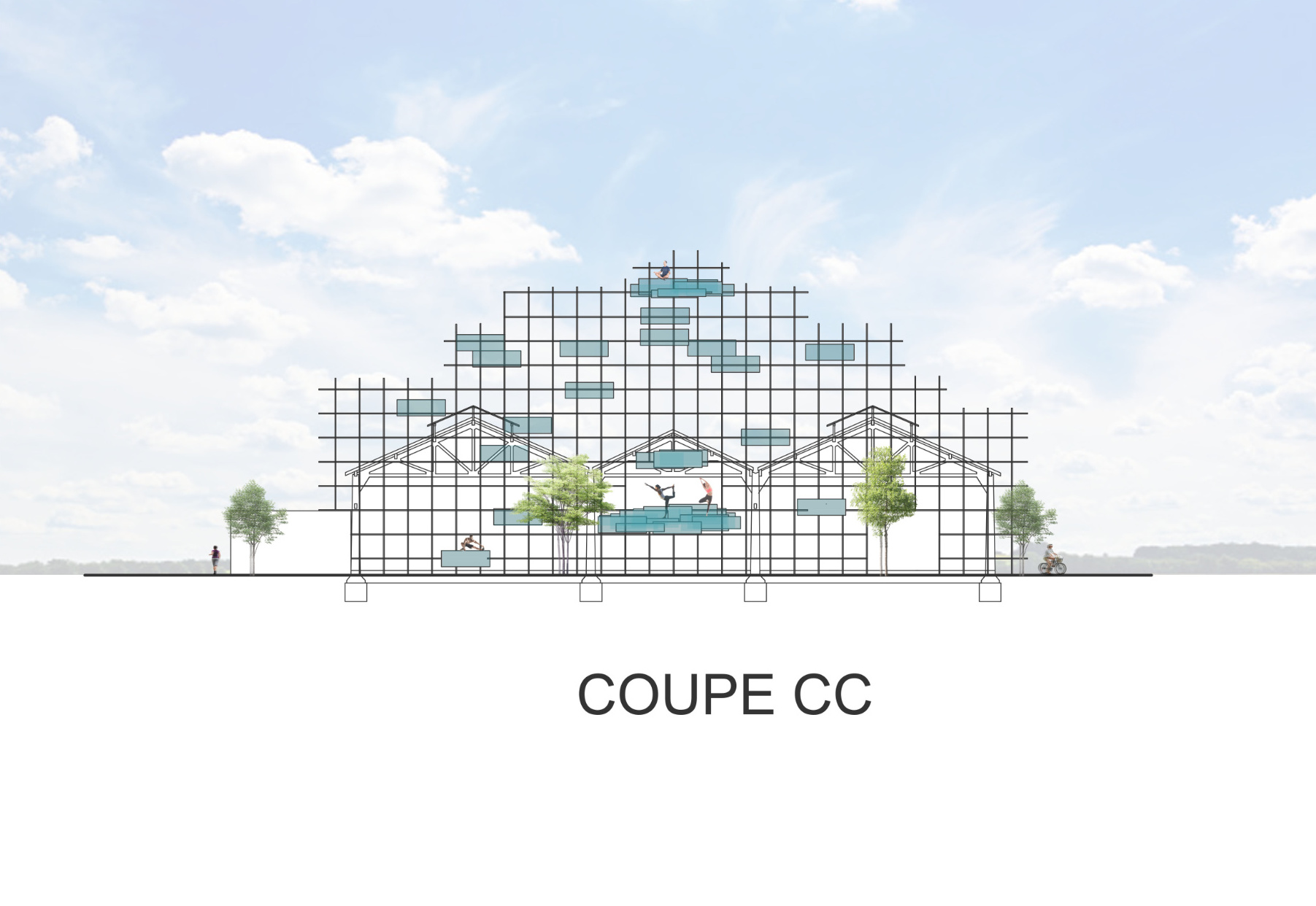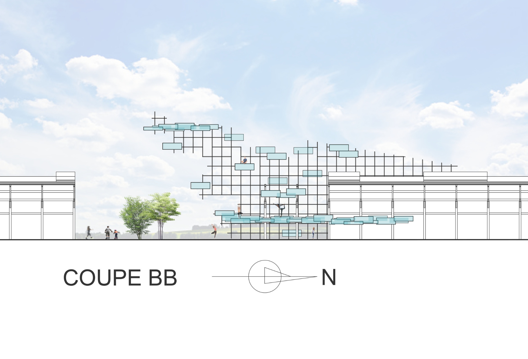 et extérieur. Le projet se situe sur la coulée verte qui traverse les Halles en leur